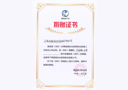 捐贈證書 周浦鎮(zhèn)人民鎮(zhèn)府